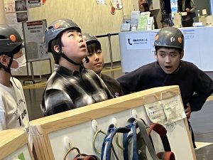 安全器具のつけ方も習って ヘルメットをかぶり 皆で体験しました。 一歩踏み出してやってみる。あれ?やってみたら出来たよ。こういった